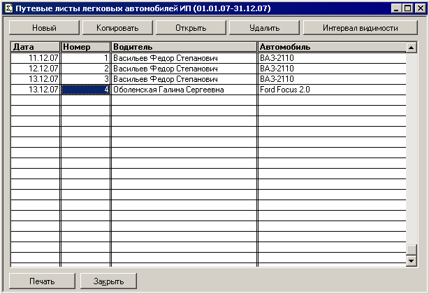 Интерфейс программы "Путевой лист легкового автомобиля индивидуального предпринимателя" для 1С (Журнал документов) |