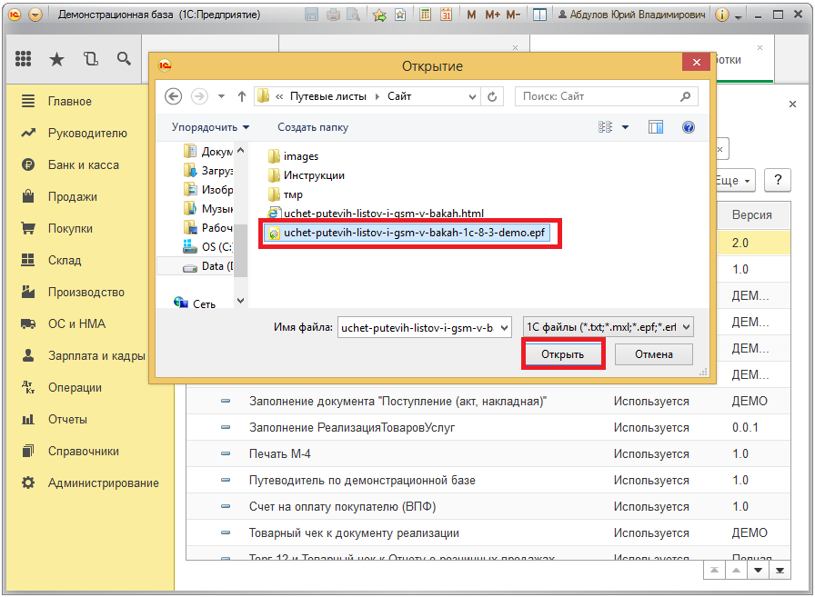 В диалоге находите и открываете файл uchet-putevih-listov-i-gsm-v-bakah-1c-8-3-demo.epf: