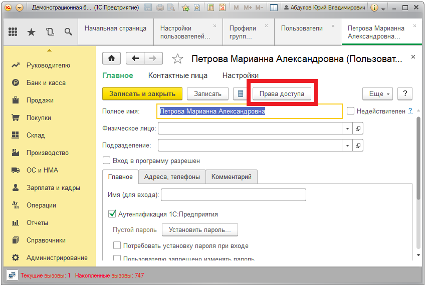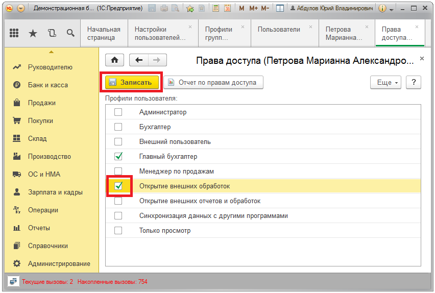 8. Подключаем пользователю дополнительный созданный выше профиль (устанавливаем "галку"). Сохраняем изменения.