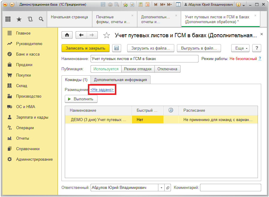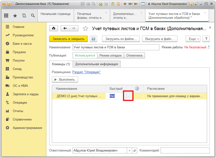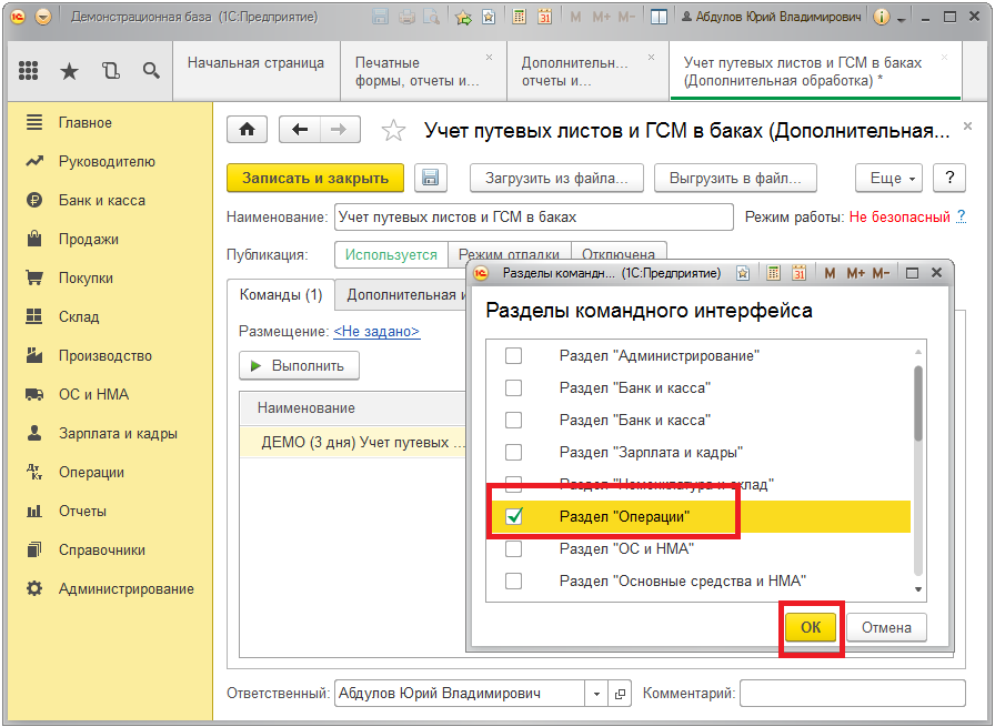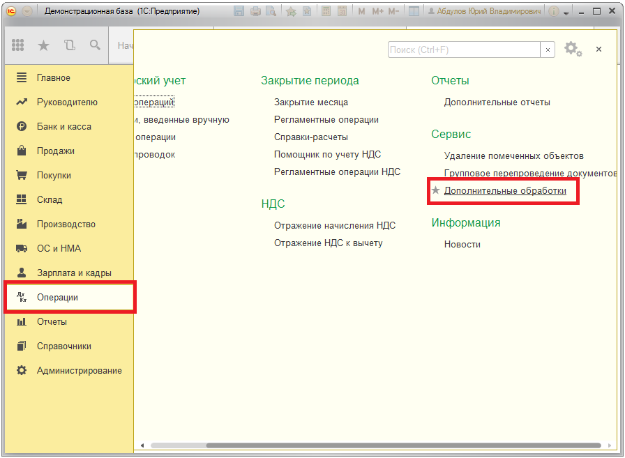 1. Открываем меню подключенного раздела (в нашем случае это "Операции") и нажимаем ссылку "Дополнительные обработки".
