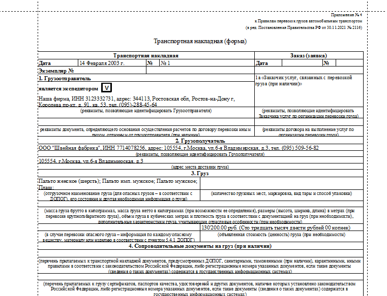 (Приложение № 4 к Правилам перевозок грузов автомобильным транспортом)