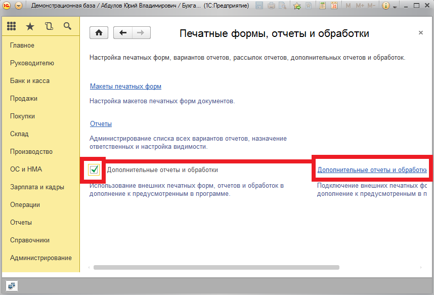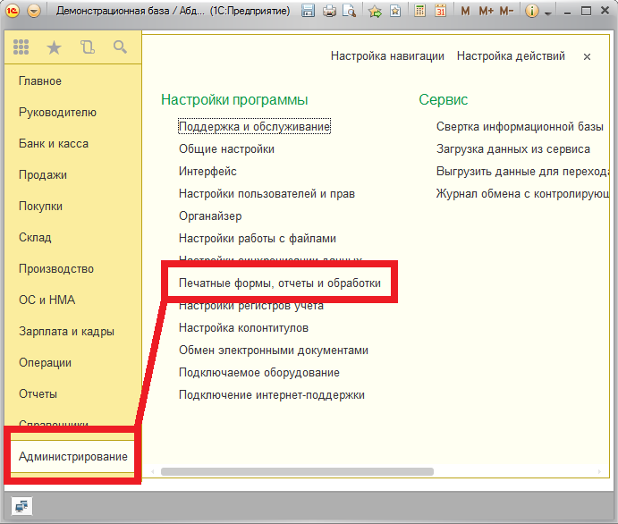 "Администрирование", на панели навигации пункт "Дополнительные отчеты и