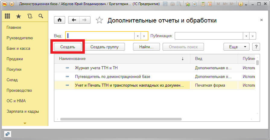 "Дополнительные отчеты и обработки" - пункт "Создать"