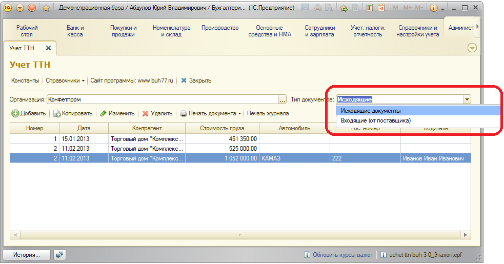 Транспортных накладных Исходящих и Входящих (от поставщика) |