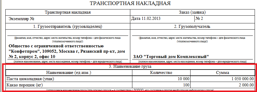 сведений о грузе (краткое наименование, вид упаковки, способ определения